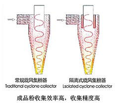變頻式分析機+隔離式旋風集粉器,選粉和集粉效率高,成品粒度可達1.6-0.045mm。
